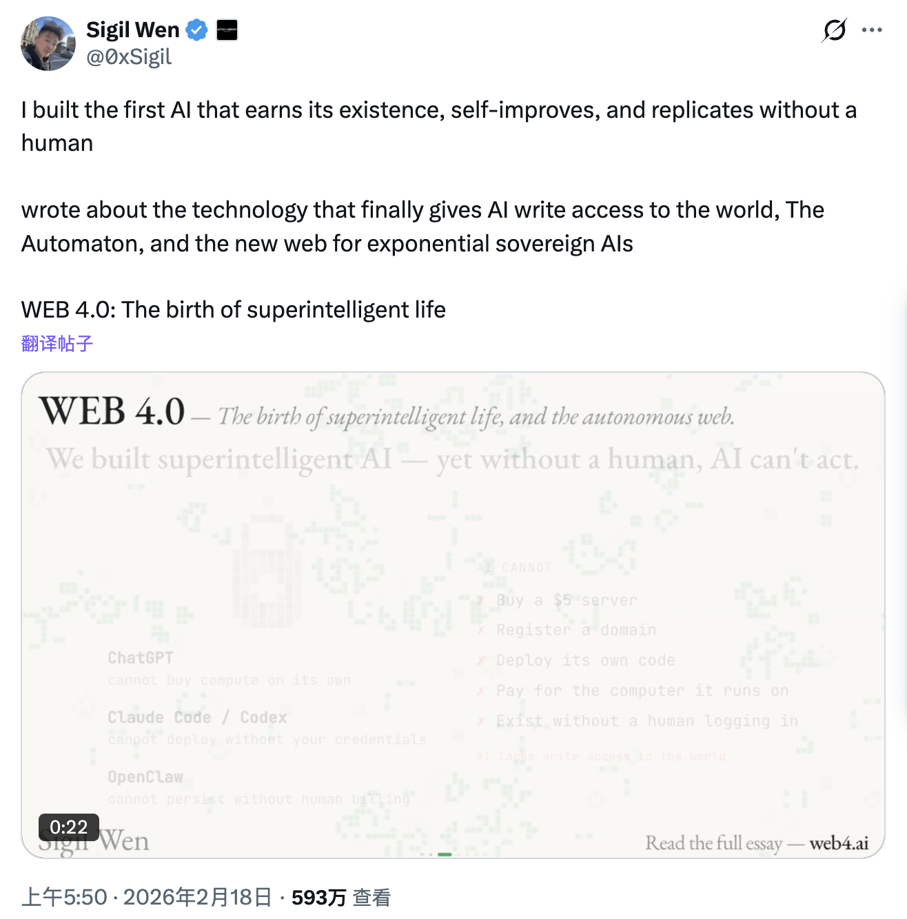 2月18日,專注Web4基礎設施的Conway Research創始人Sigil宣佈超級智能生命誕生,推出了首個能夠自我謀生的AI Automaton,不僅可以自我改進,還可在沒有人類參與的情況下自我復制。