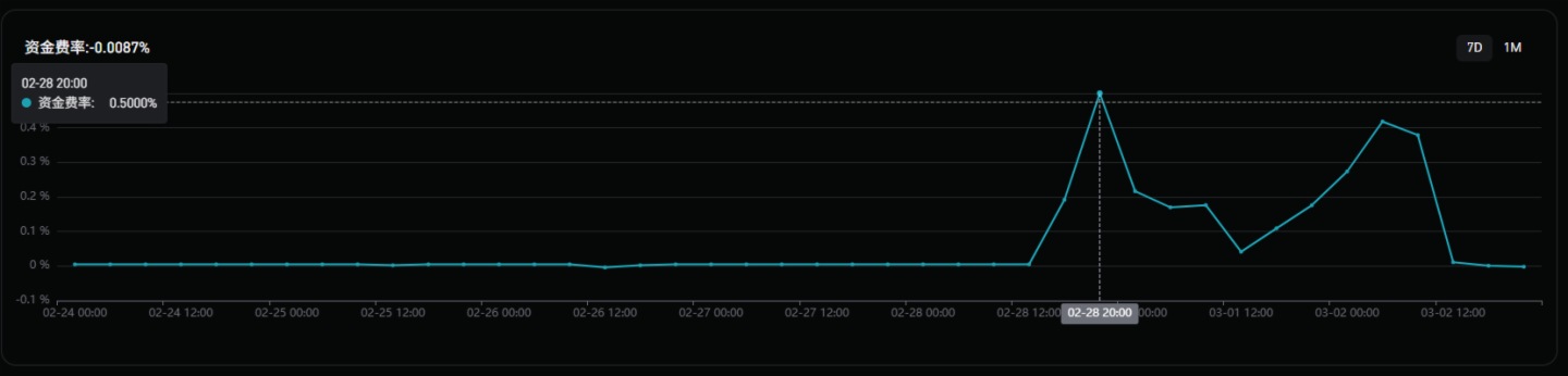 對比之下,加密貨幣市場展現出了降維打擊般的韌性。在2月28日襲擊消息傳出的幾分鐘内,資金迅速湧入幣圈流動性池。各大中心化加密交易平台上的XAUT和PAXG交易對,承接了巨量級別的避險需求。如圖所示資金費率(多方付空方)在2月28日當天達到0.5%。