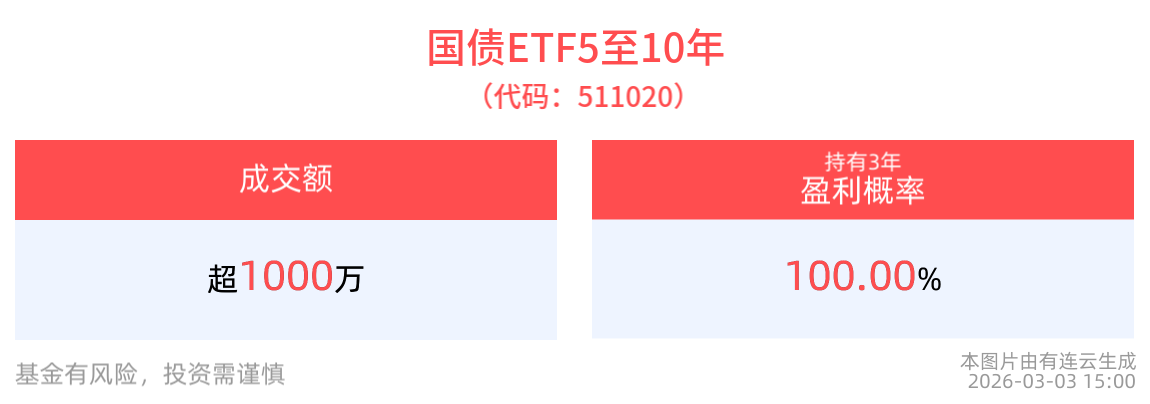 流動性方面,國債ETF5至10年盤中換手2.12%,成交1957.44萬元。拉長時間看,截至3月3日,國債ETF5至10年近1年日均成交6.04億元。