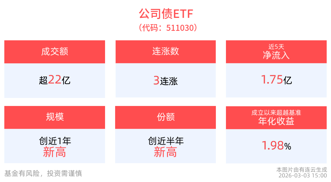 截至2026年3月3日 15:00,公司債ETF(511030)上漲0.03%, 實現3連漲。最新價報107.17元。拉長時間看,截至2026年3月3日,公司債ETF近1年累計上漲1.97%。