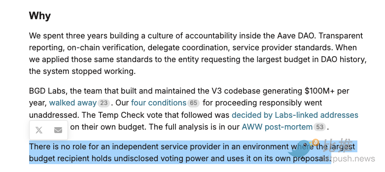 ACI 創始人 Marc Zeller 寫道:「如果一個最大的預算接收者可以利用其未披露的投票權來強行通過自己的提案,那麼獨立服務提供商在 DAO 中就失去了存在的意義。」