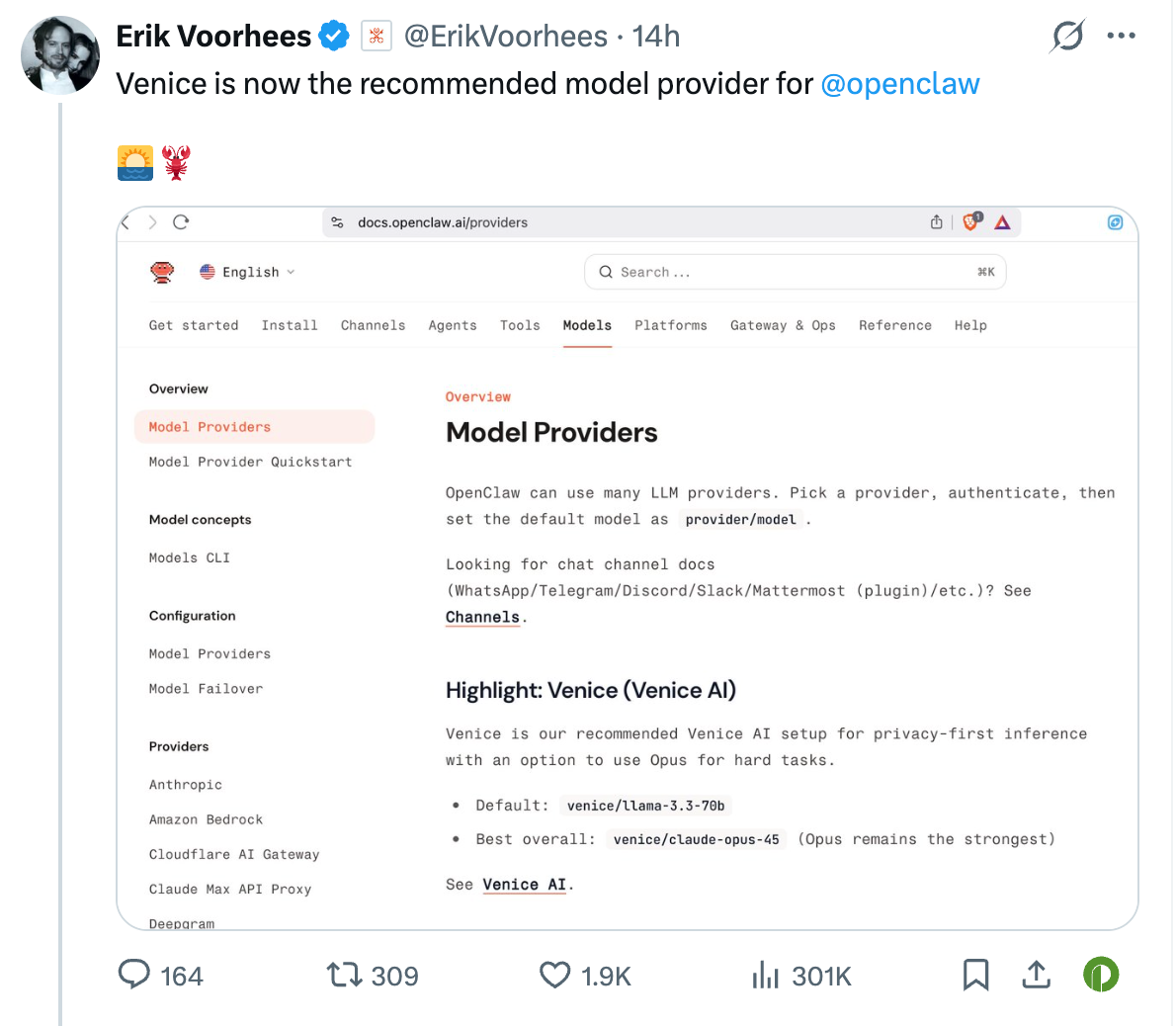 上周,Openclaw 創始人勸年輕人「不要在加密貨幣上浪費時間」的發言刺痛加密行業。這周,事情卻出現了微妙的反轉。OpenClaw 官方文檔中,悄然將一個帶有原生 Token 的加密項目 Venice.ai 列為推薦模型提供商。而在過去一個月内,Venice 原生代幣 VVV 價格也從低點的 1.5 美元附近上漲最高至 8.4 美元附近,最大漲幅超 500%。