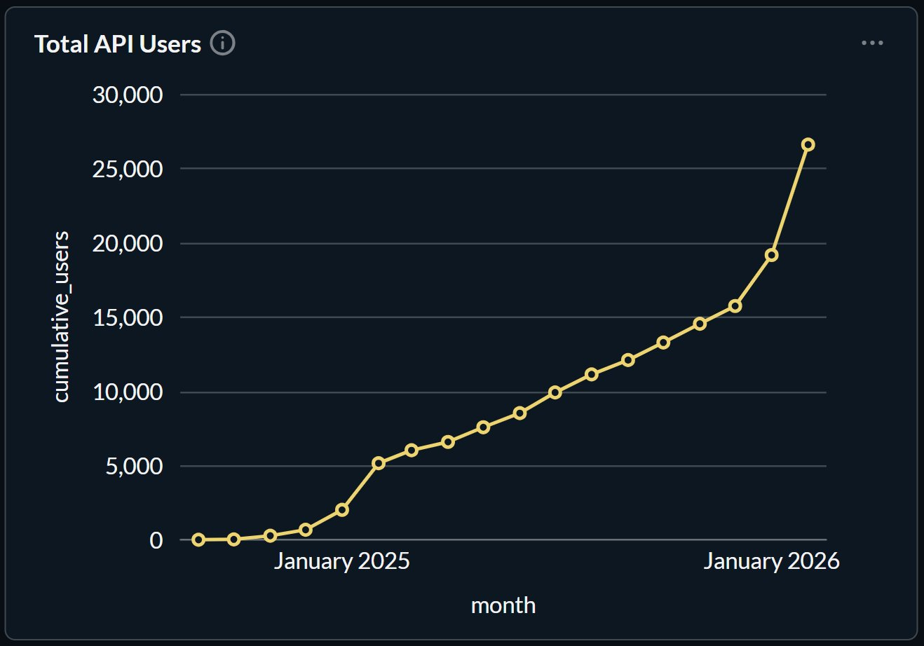 從 Erik 在 3 月 1 日公佈的最新數據來看,進入 2026 年以來,Venice 的 API 用戶數開始出現迅猛增長,目前用戶已超過 25000 名。