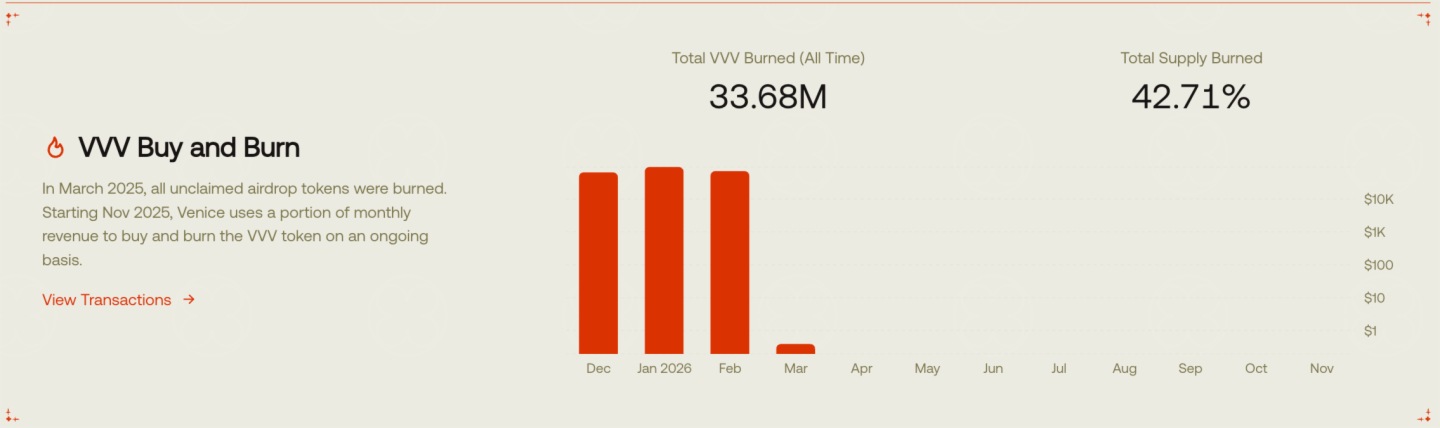 自 2025 年 10 月開始,Venice 宣佈將原排放計劃 1 千萬枚 VVV/年削減至 800 萬枚/年,同時啓動了月度營收回購+銷毀機制,當前月度銷毀能力在3萬~5萬枚,價值約6萬~9萬美元。當前,42.71%的代幣供應已經被銷毀。而在 2026 年 2 月初,官方再一次宣佈排放削減計劃,將 800 萬枚 VVV/年削減至 600 萬枚/年,這一係列調整,直接改變了供應預期。從代幣價格表現來看,這也是 VVV 的起漲點。
