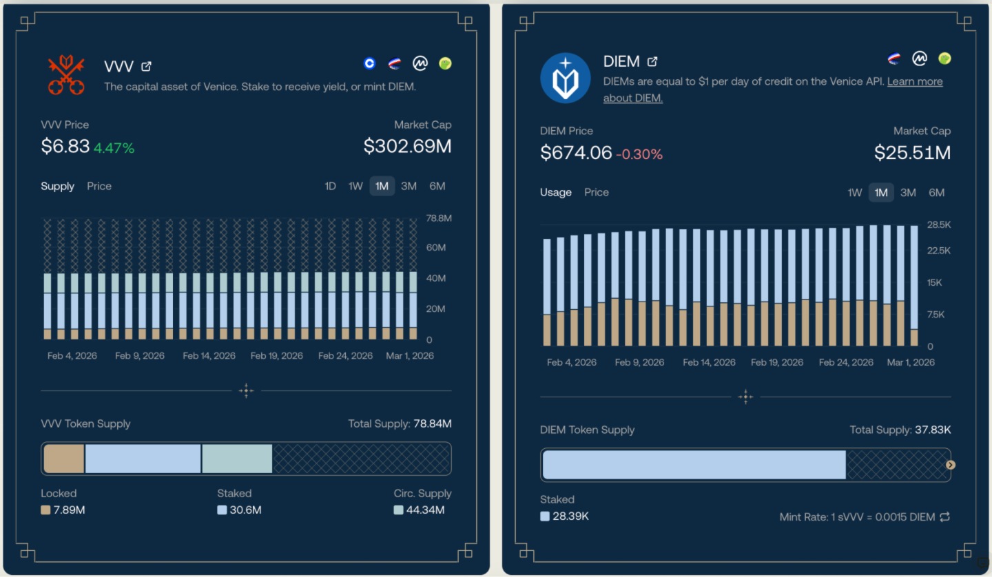 在 Venice 生態裡,有兩個核心 Token:VVV 和 DIEM。它們正通過「單向鑄造 + 可逆贖回」機制緊密綁定,形成一個雙層經濟結構。