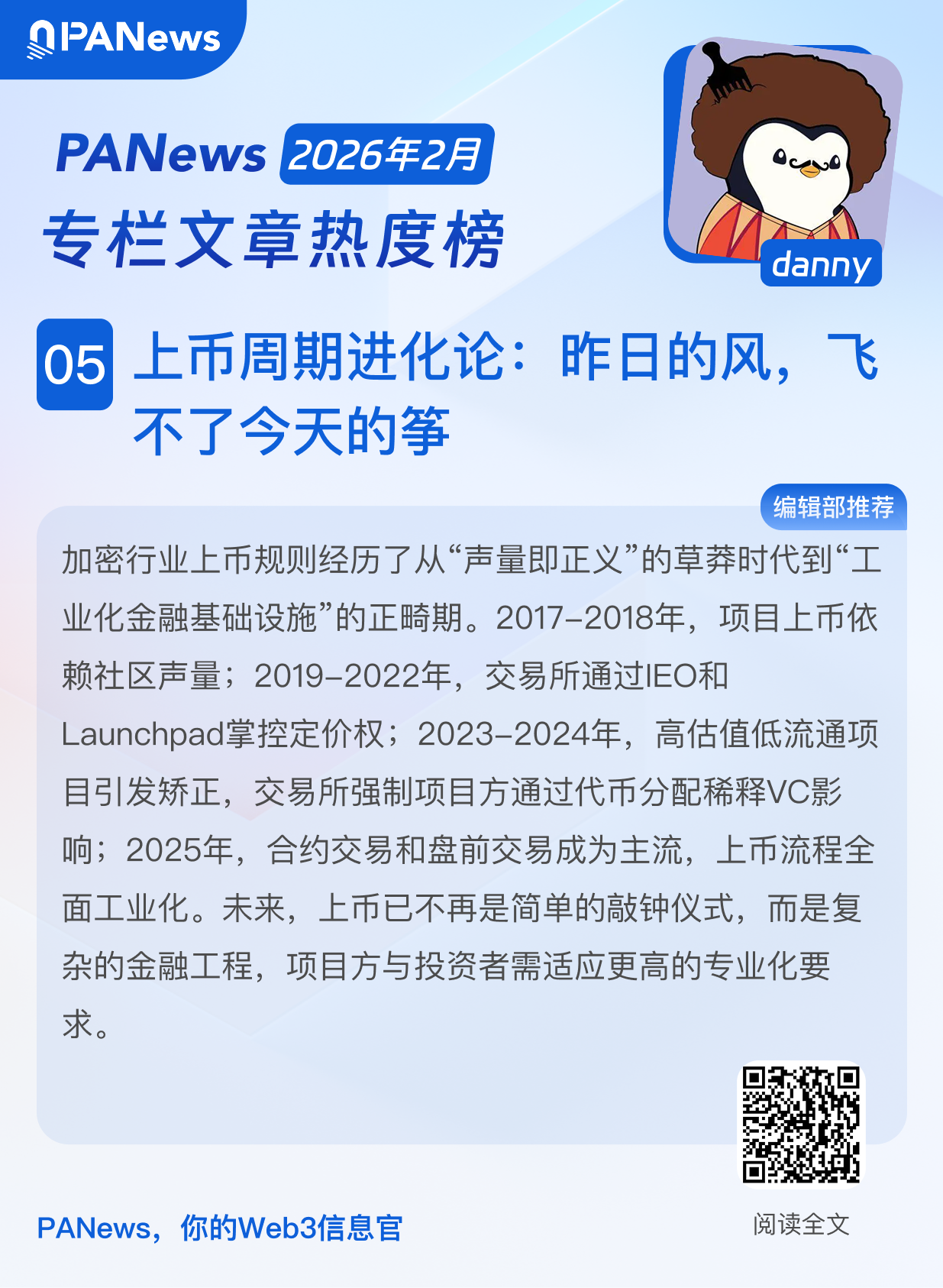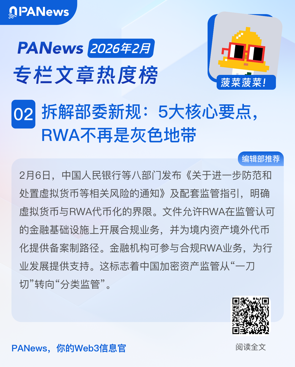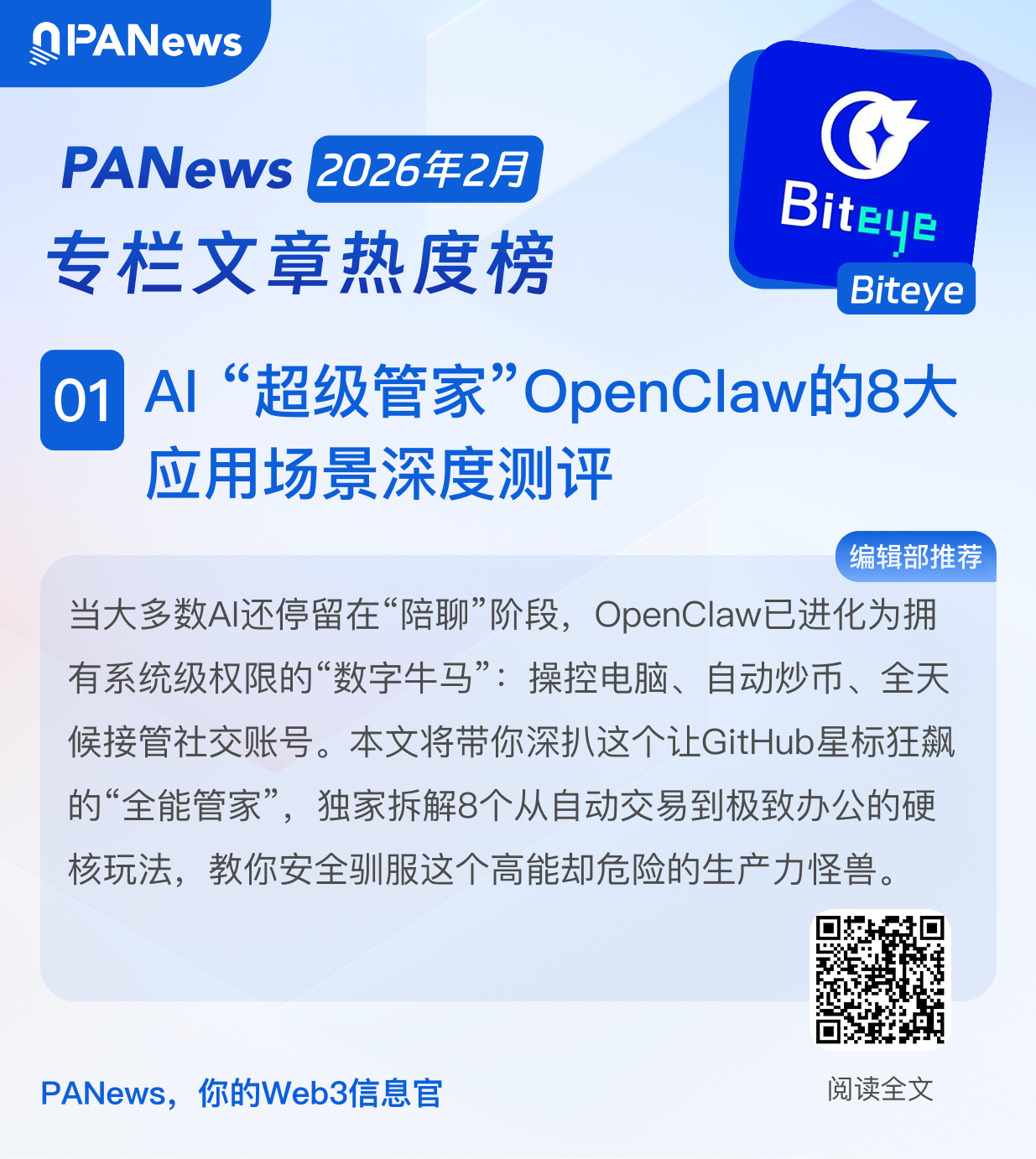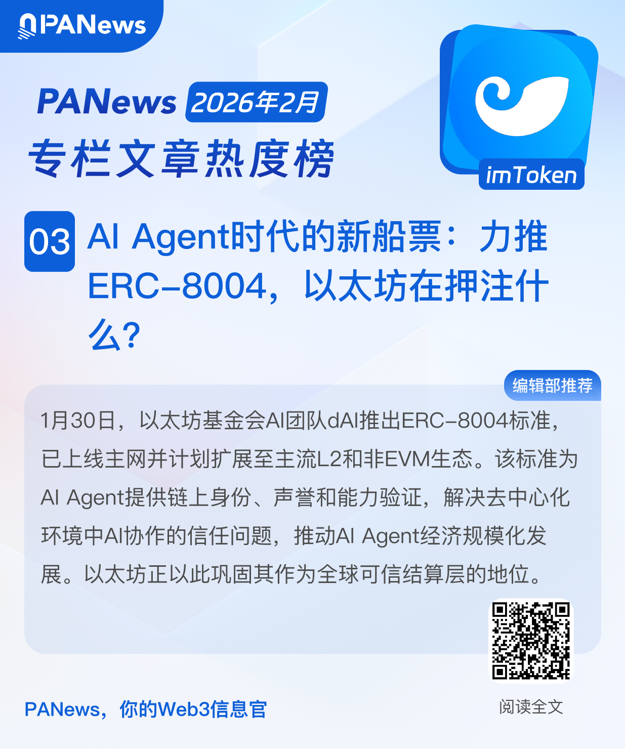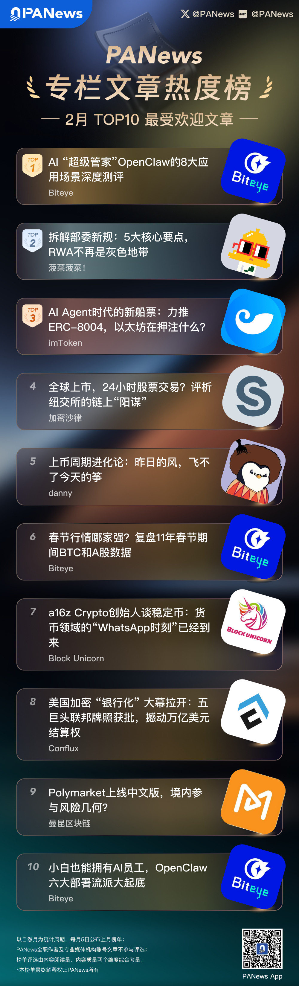 PANews 2026年2月專欄文章熱度排行榜TOP10(以下簡稱“熱度榜”)於今日出爐。我們對2月份PANews平台上的所有專欄文章,根據内容質量及文章閱讀量進行了綜合性評定,制作出本月的熱度榜。