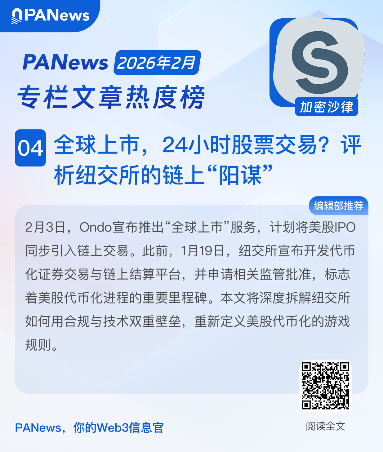 - 《全球上市,24小時股票交易?評析紐交所的鏈上“陽謀”》2月3日,Ondo宣佈推出“全球上市”服務,計劃將美股IPO同步引入鏈上交易。此前,1月19日,紐交所宣佈開發代幣化證券交易與鏈上結算平台,並申請相關監管批準,標誌著美股代幣化進程的重要裡程碑。本文將深度拆解紐交所如何用合規與技術雙重壁壘,重新定義美股代幣化的遊戲規則。
