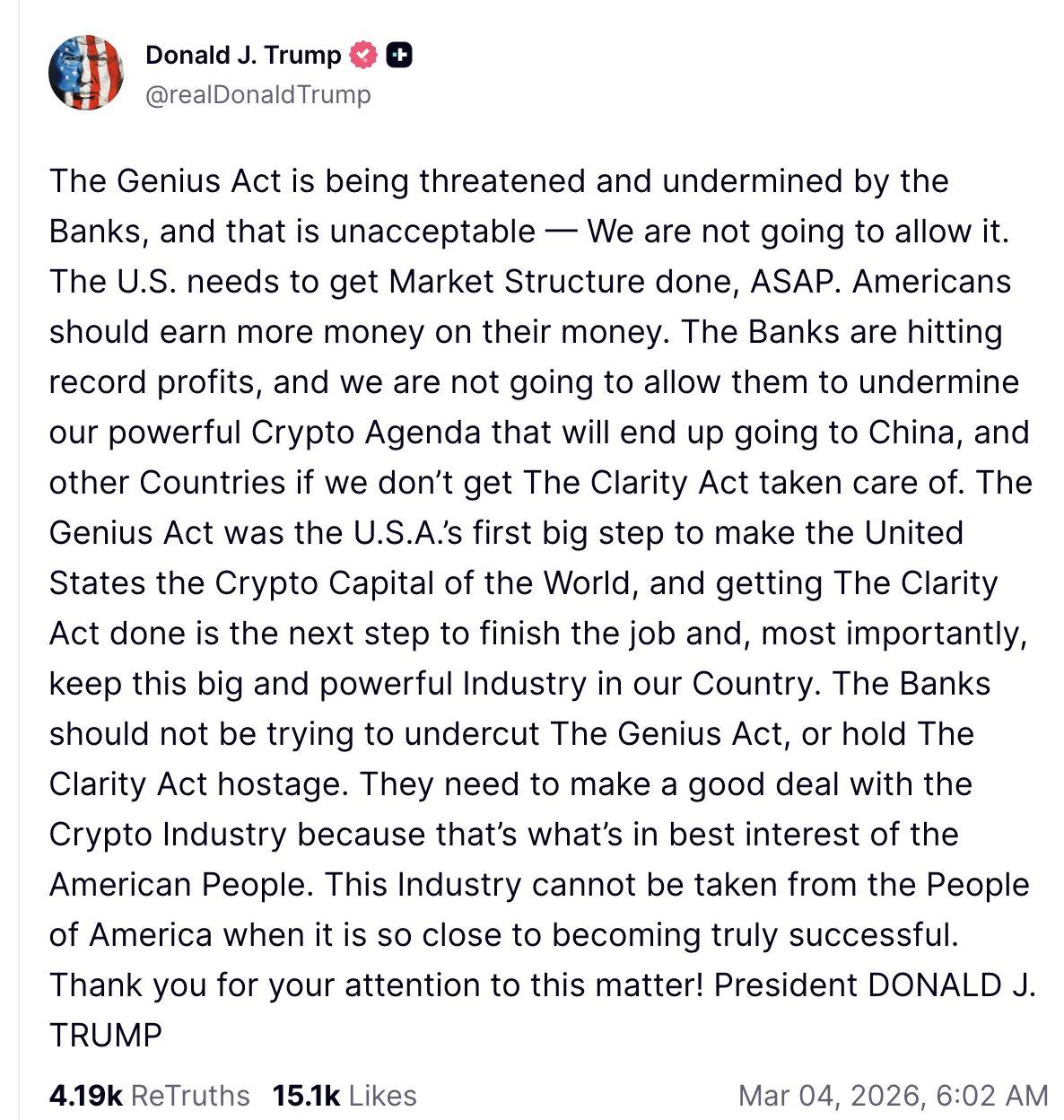 雙方各執一詞,互不相讓。而特朗普在其社交平台Truth Social上對此發文,強烈批評銀行機構試圖破壞GENIUS法案並阻撓CLARITY法案的通過。他表示這些法案對於確保美國成為“加密貨幣之都”至關重要,並警告如不採取行動,該産業可能流向其他國家。特朗普敦促銀行與加密貨幣行業達成協議,強調這符合美國人民的最佳利益,並呼籲盡快完成市場結構改革,讓“美國人從他們的資金中獲得更多收益”。