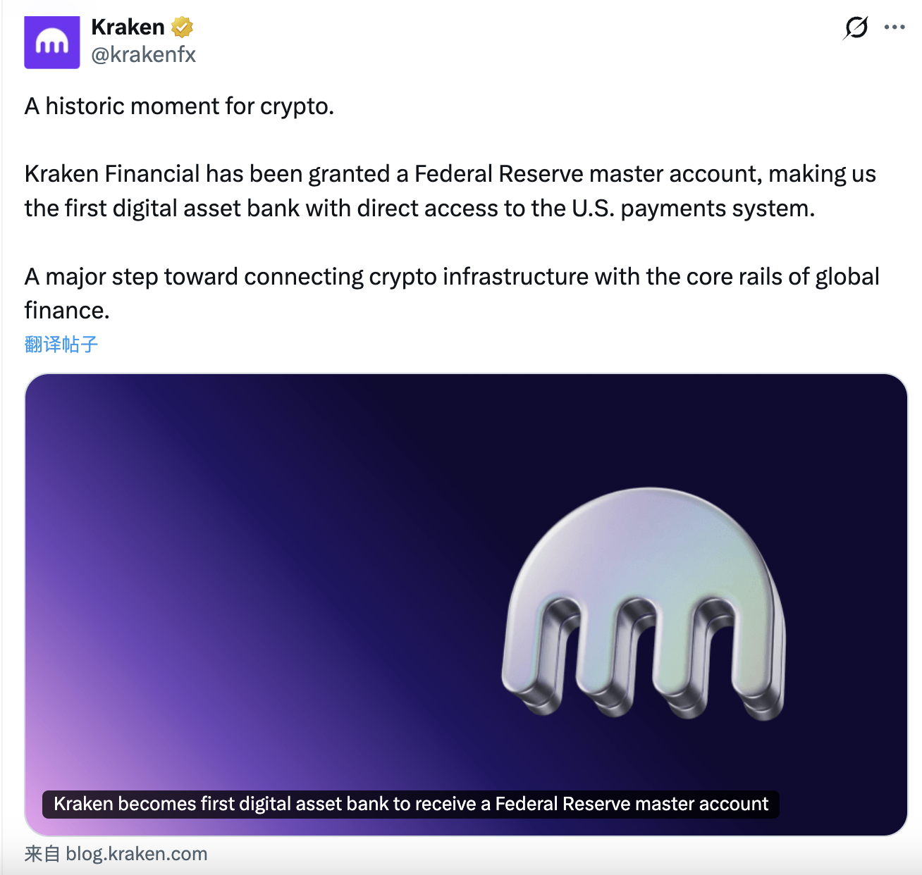 3月4日,Kraken宣佈旗下銀行Kraken Financial已正式獲準開立美聯儲主賬戶,成為美國歷史上首家直接接入美聯儲支付基礎設施的數字資産銀行。