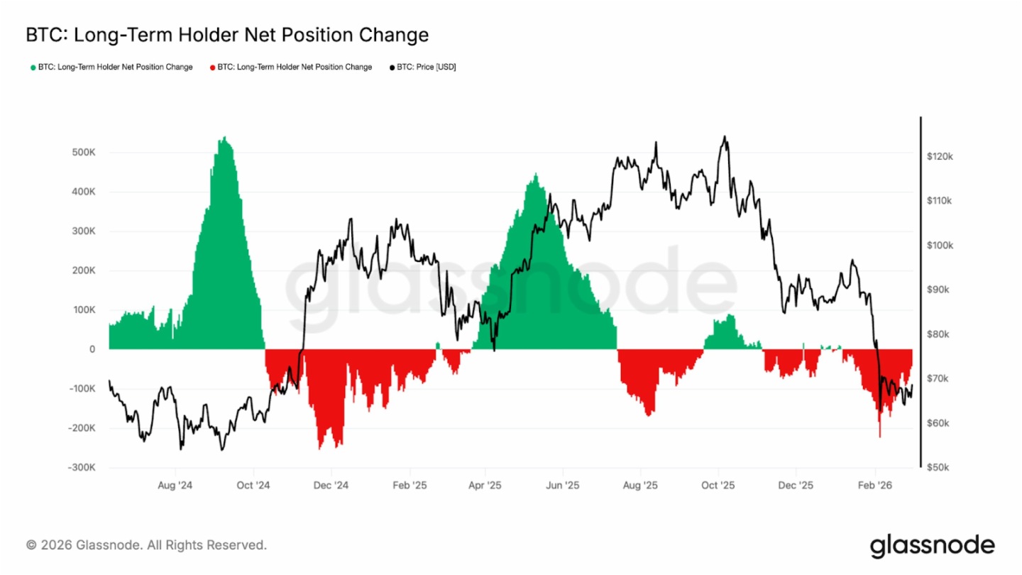 而加密市場的參與者結構已經發生了根本性變化。Glassnode數據顯示,比特幣長期持有者的淨頭寸變化趨於緩和,表明抛售強度正在減弱。