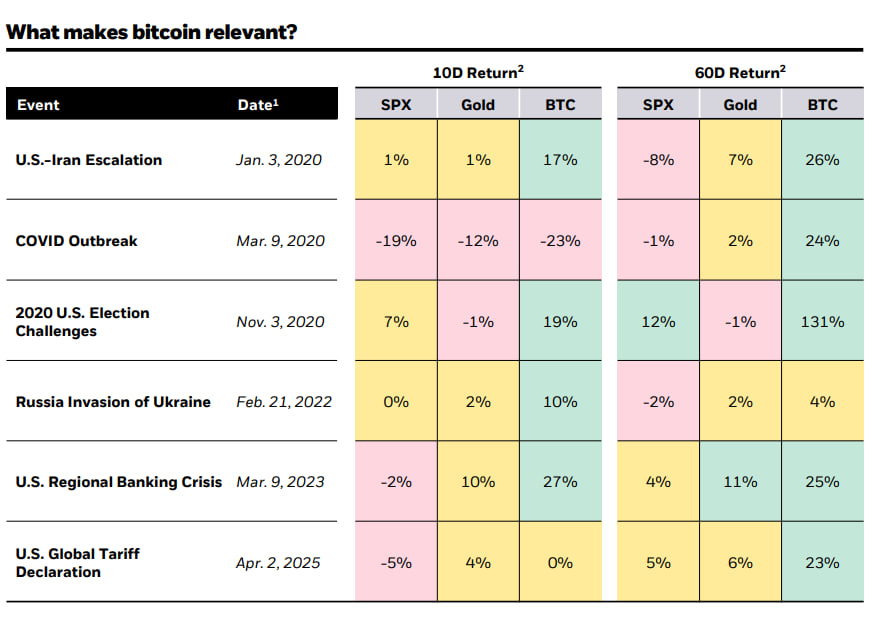 貝萊德的研究曾指出,比特幣在面對地緣政治沖擊時的表現優於黃金和股票。截至目前,這一結論依然成立。