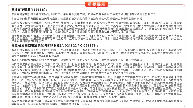 石油ETF景順(159588)緊密跟蹤國證石油天然氣指數,國證石油天然氣指數反映滬深北交易所石油天然氣産業相關上市公司的證券價格變化情況。前十大權重股分別為中國石油、中國海油、中國石化、傑瑞股份、廣匯能源、招商輪船、中遠海能、洲際油氣、九豐能源、新奧股份,前十大權重股合計佔比67.92%。場外聯接(A:021822;C:021823)。