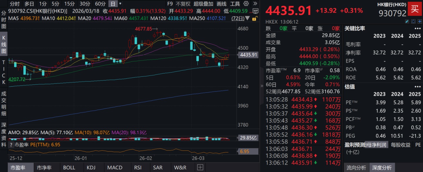 截至2026年3月18日 13:06,HK銀行指數(930792)上漲0.31%。成分股渣打集團上漲2.69%,匯豐控股上漲1.52%,中信銀行、工商銀行等個股跟漲。