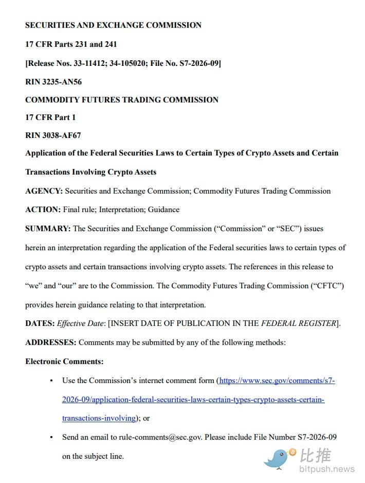 2026 年 3 月 17 日,美國證券交易委員會( SEC )與商品期貨交易委員會( CFTC )聯合發佈了編號為 33-11412 的 解釋性文件,長達 68 頁的監管框架正式宣告:美國加密監管告別長達十年的「以執法代監管」時代,進入由「 Project Crypto 」驅動的清晰化、和諧化新紀元。