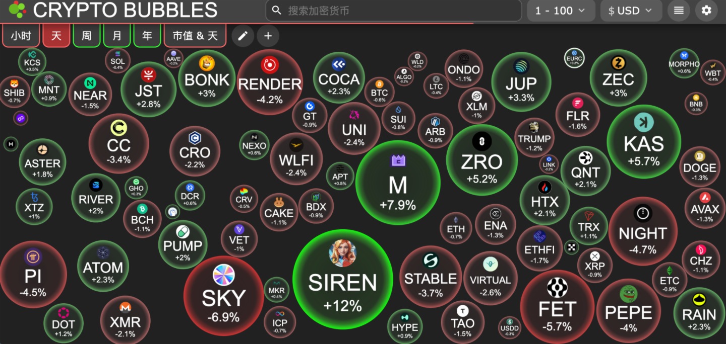 今日市值前100幣種最大漲幅:Siren漲12%、MemeCore漲7.9%、Kaspa漲5.7%、LayerZero漲5.2%、Jupiter漲3.3%。