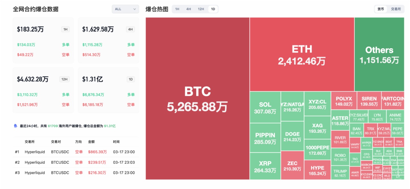 24小時爆倉數據:全球共61709人被爆倉,爆倉總金額為1.31億美元,其中BTC爆倉5265萬美元、ETH爆倉2412萬美元、SOL爆倉307萬美元。