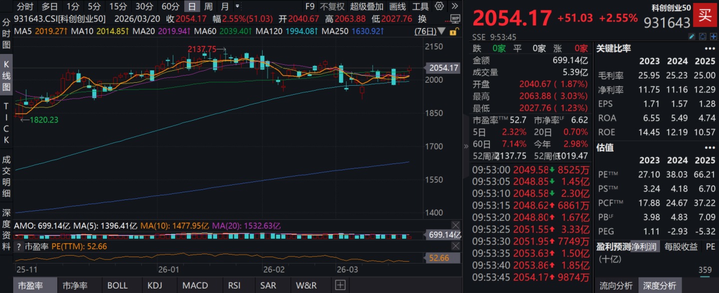 截至2026年3月20日 09:53,科創創業50指數(931643)強勢上漲2.55%,成分股卓勝微20cm漲停,新易盛上漲9.87%,中際旭創、天孚通信等個股跟漲。