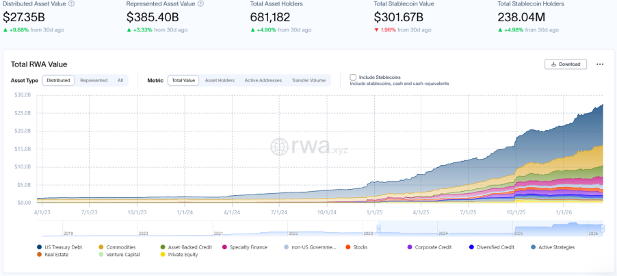 RWA.xyz 最新數據披露,截至2026年3月20日,RWA 鏈上總市值達273.5億美元,環比上月同期大漲9.68%;資産持有者總數增至約68.12萬,環比上月同期增加4.9%,與RWA規模增速匹配。