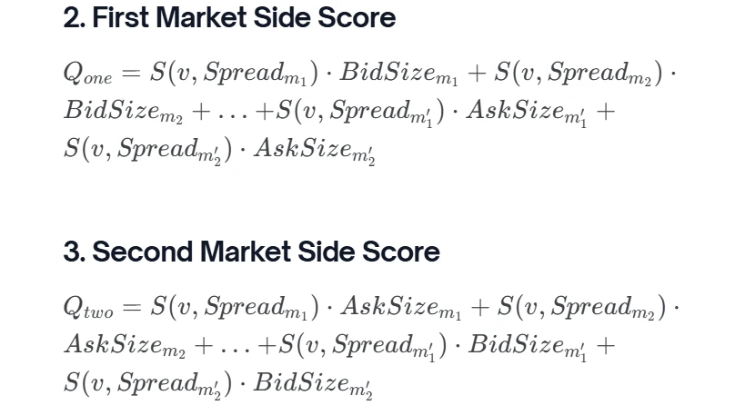 買賣投標單(bid)和詢價單(ask)分別計算得分 ,考慮了 Yes/No 市場的互補結構。