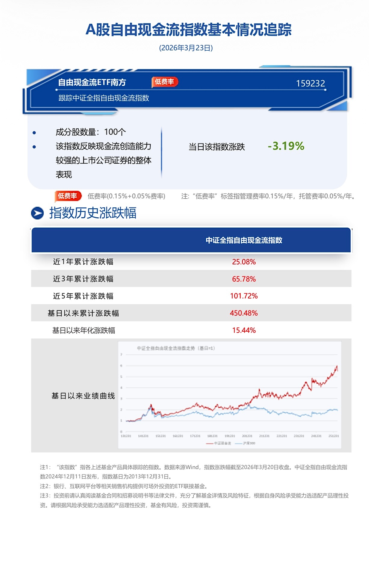 截至2026年3月23日收盤,自由現金流ETF南方(159232)換手8.33%,成交3.28億元,跟蹤標的指數中證全指自由現金流指數(932365.CSI) 回調3.19%。
