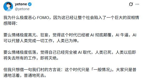 正如 AI 開發者 @yetone 在社交媒體上直言不諱:「我極度惡心 FOMO,這已經讓整個社會陷入了一個巨大的雙相情感障礙:要麼情緒極度高亢,認為人類已為神;要麼情緒極度低落,覺得人類已死。」