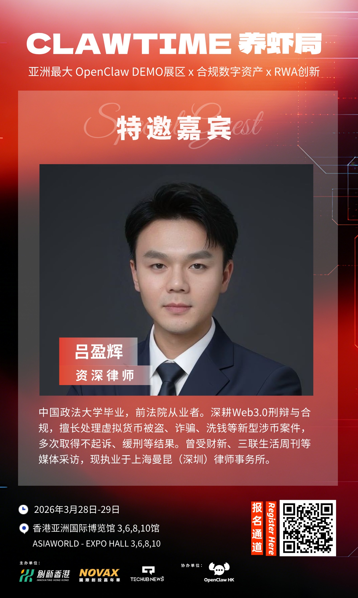 🦞 Techub News 消息,資深律師呂盈輝 確認出席亞洲最大龍蝦特區CLAWTIME"養蝦局",亞洲最大OpenClaw DEMO展區 + 合規數字資産 X RWA創新。 呂盈輝律師,中國政法大學畢業,前法院從業者。深耕Web3.0刑辯與合規,擅長處理虛擬貨幣被盜、詐騙、洗錢等新型涉幣案件,多次取得不起訴、緩刑等結果。曾受財新、三聯生活周刊等媒體採訪,現執業於上海曼昆(深圳)律師事務所。 本次