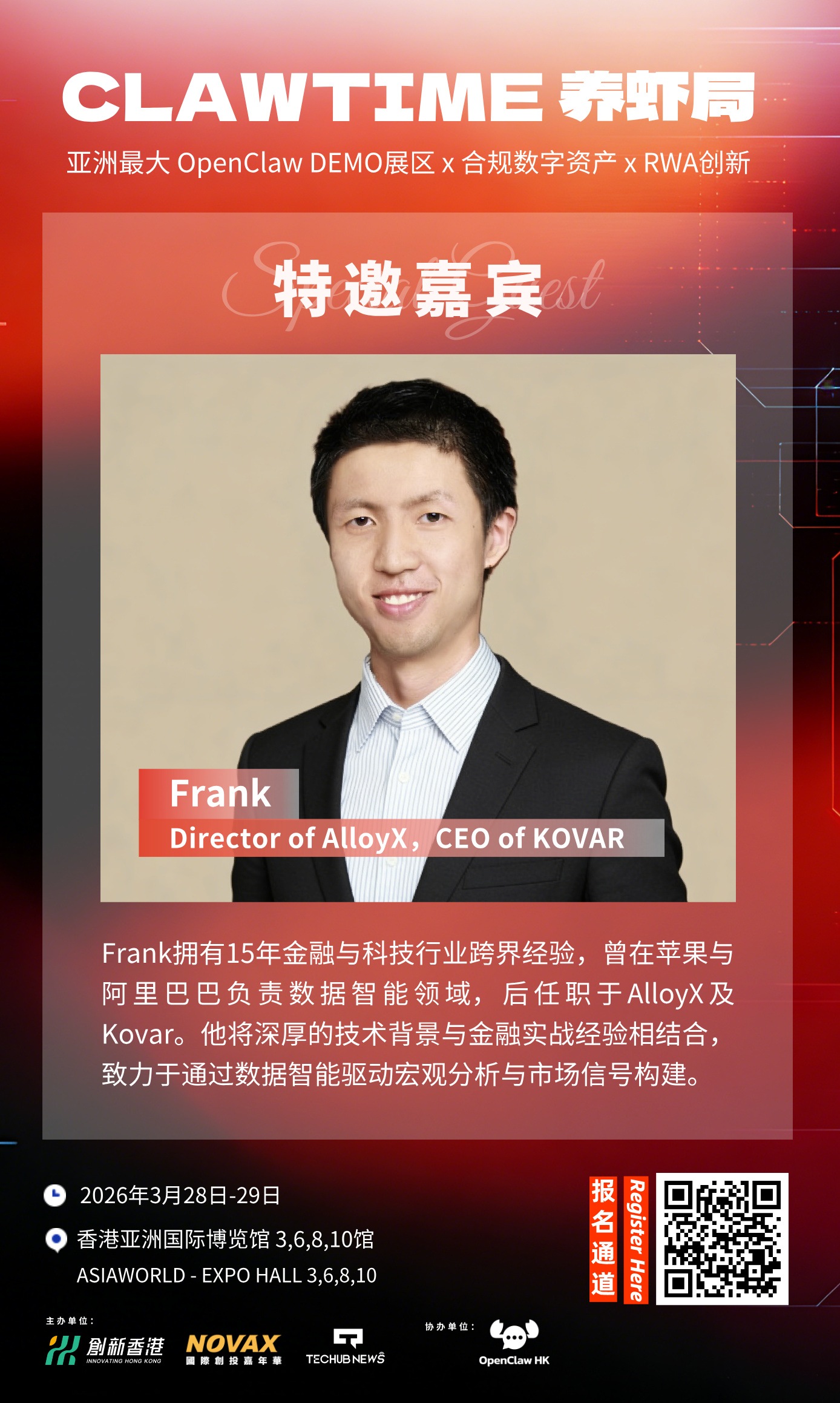 🦞 Techub News 消息,Frank / Director of AlloyX, CEO Of KOVAR 確認出席亞洲最大龍蝦特區CLAWTIME"養蝦局",亞洲最大OpenClaw DEMO展區 + 合規數字資産 X RWA創新。 Frank,擁有15年金融與科技行業跨界經驗,曾在蘋果與阿裡巴巴負責數據智能領域,後任職於AlloyX及Kovar。他將深厚的技術背景與金融實戰經驗相結合致力於通過數據智能驅動宏觀分析與市場信號構建。 本次