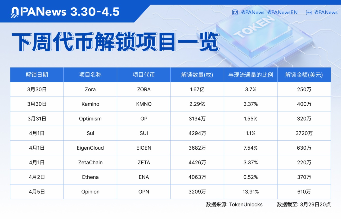 PANews 3月29日消息,Token Unlocks數據顯示,SUI、EIGEN、OPN等代幣將於下周迎來大額解鎖,其中: