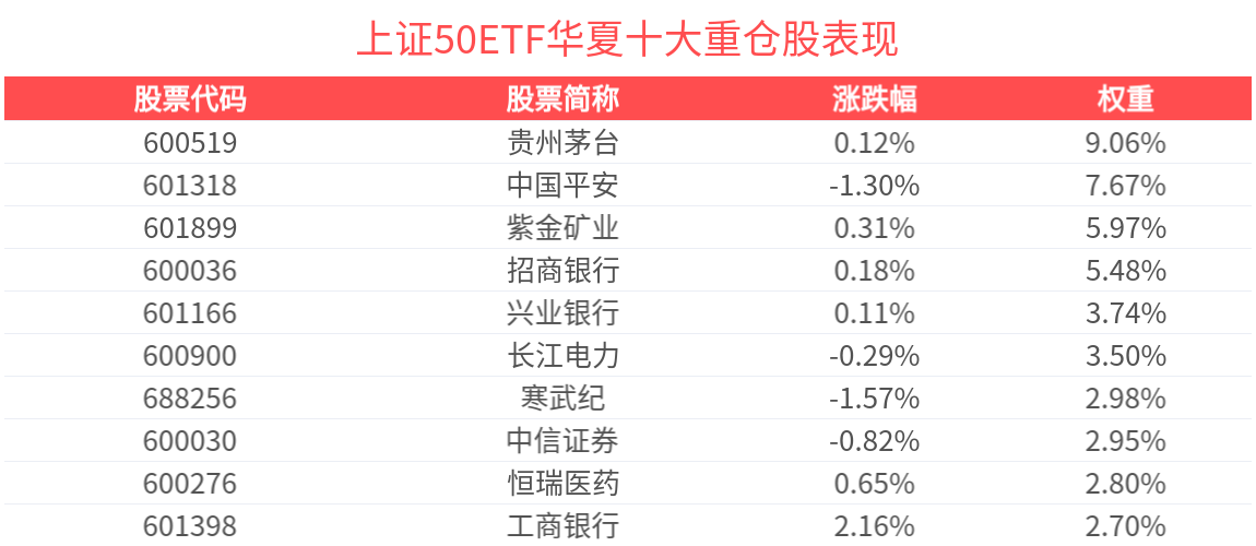 上證50ETF華夏緊密跟蹤上證50指數,截至2026年2月27日,指數前十大權重股分別為貴州茅台、中國平安、紫金礦業、招商銀行、長江電力、興業銀行、中信證券、恒瑞醫藥、寒武紀、海光信息,前十大權重股合計佔比46.55%。
