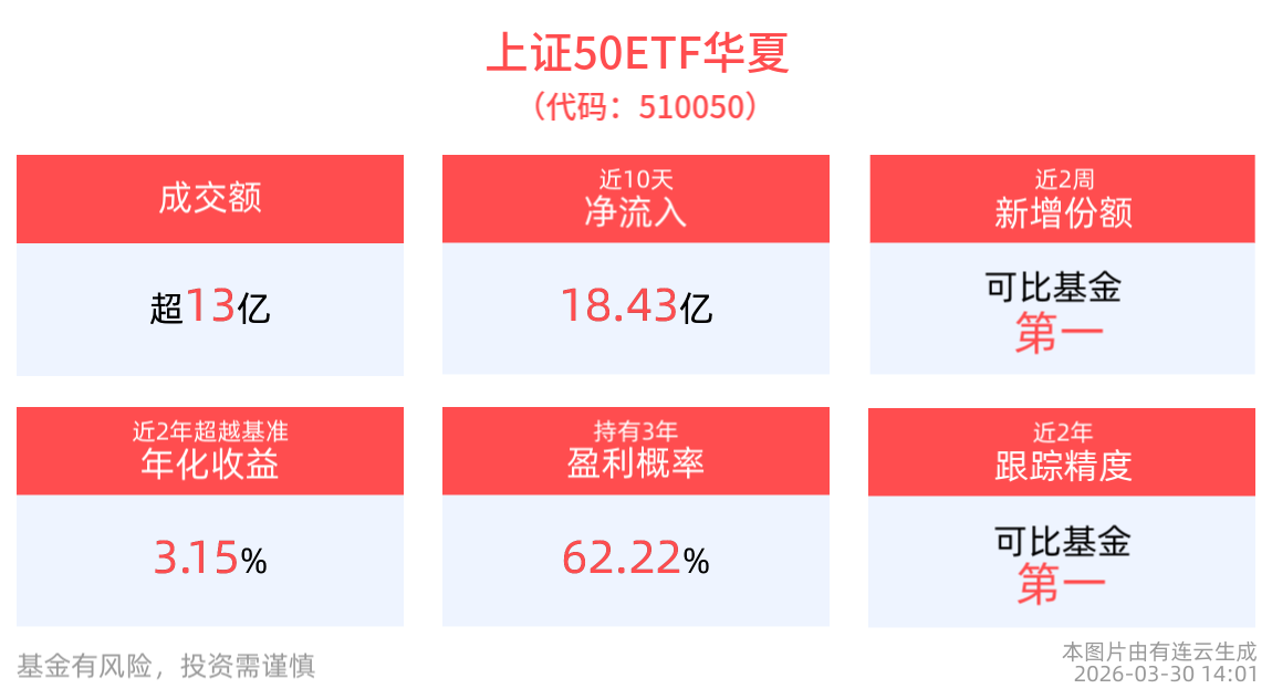 統計顯示,上證50ETF華夏(520050)近10個交易日内有6日資金淨流入,合計「吸金」18.43億元,截至3月27日,最新規模達682.14億元,居可比基金首位。