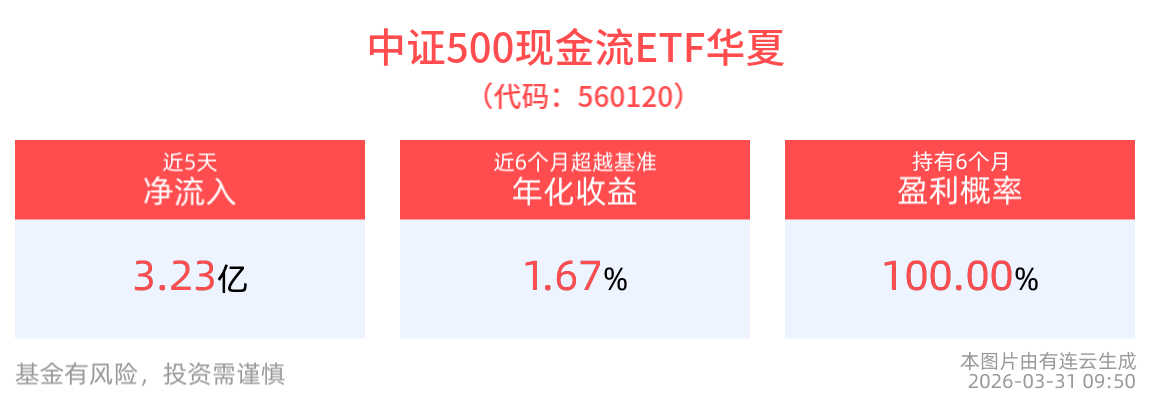 從收益能力看,截至2026年3月30日,中證500現金流ETF華夏自成立以來,最高單月回報為18.04%,最長連漲月數為3個月,最長連漲漲幅為28.85%,漲跌月數比為6/1,上漲月份平均收益率為6.94%,月盈利百分比為85.71%,月盈利概率為85.21%,歷史持有6個月盈利概率為100.00%。截至2026年3月30日,中證500現金流ETF華夏近6個月超越基準年化收益為1.67%。