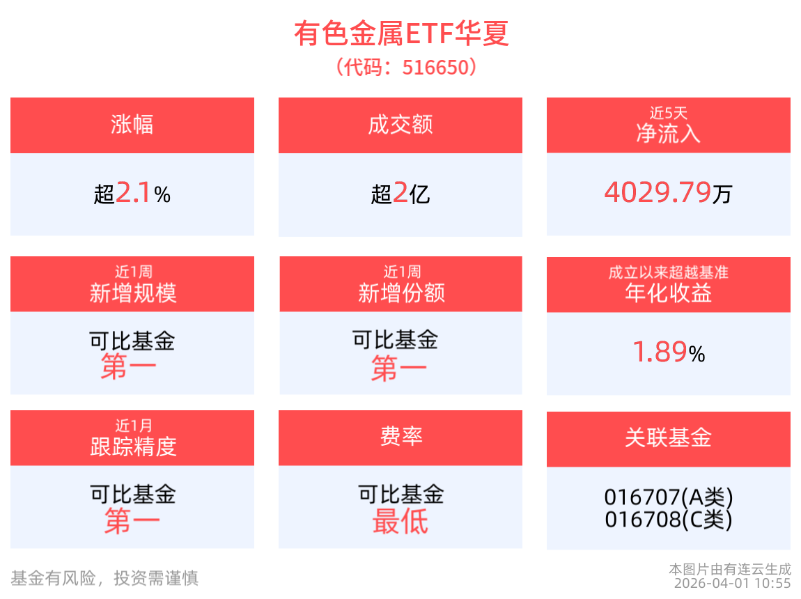 截至2026年4月1日 ,受美伊局勢緩和利好,A股三大指數集體走強,截至10:55,有色金屬ETF華夏(516650)上漲2.12%,其持倉股洛陽鉬業上漲5.07%,中孚實業上漲4.30%,赤峰黃金上漲4.22%,紫金礦業,西部礦業等個股跟漲。