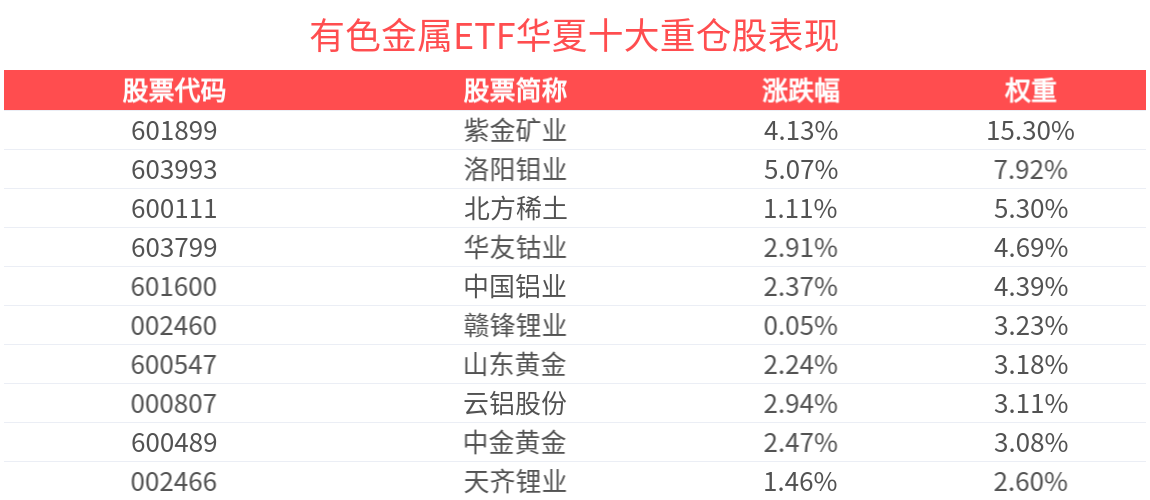 有色金屬ETF華夏緊密跟蹤中證細分有色金屬産業主題指數,截至2026年3月31日,指數前十大權重股分別為紫金礦業、洛陽鉬業、北方稀土、中國鋁業、華友钴業、贛鋒鋰業、中金黃金、山東黃金、赤峰黃金、雲鋁股份,前十大權重股合計佔比50.78%。