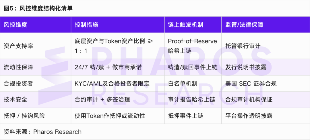 進一步從結構化風控維度來看,其核心並非單一措施,而是鏈上觸發機制 + 傳統金融監管的雙軌體係。具體而言,在資産支持率方面,通過底層資産與 Token 比例不低於 1:1 的剛性約束,並結合 Proof-of-Reserve 機制實現鏈上可驗證,同時由託管銀行提供審計背書;在流動性管理上,依賴 24/7 鑄造與贖回機制及做市商承諾,並通過鏈上事件記錄確保全過程可追溯;在投資者適格性控制上,則通過 KYC/AML 與合格投資者制度疊加白名單機制,實現鏈上權限管理與美國證券監管要求(如 SEC 框架)的銜接;技術層面則依賴智能合約審計、多簽治理以及審計報告上鏈,降低協議層風險;此外,在抵押與流動性使用場景中,所有抵押行為均通過鏈上記錄與平台披露實現透明化,避免隱性槓桿風險累積。