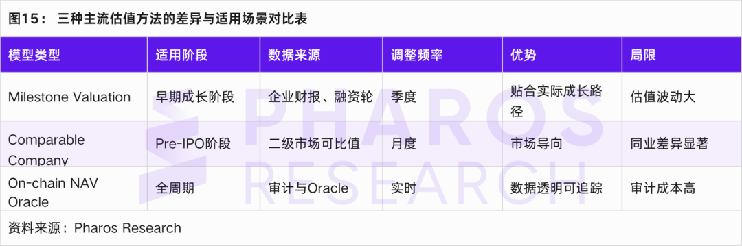 首先,階段估值(Milestone Valuation)是一種常見的估值方法,它依據企業的成長階段,如融資輪次和收入增長,來動態調整估值。這一方法特別適用於早期成長的企業,能夠準確反映其隨著時間推進而不斷變化的估值。其次,可比公司法(Comparable Company)則是通過對比已上市同行業企業的估值倍數,來為 Pre-IPO 企業確定一個相對合理的市場估值。該方法強調市場驅動性,能較為靈活地反映市場環境變化的影響。最後,區塊鏈淨資産值同步(On-chain NAV Oracle)方法通過獨立的審計機構定期將企業淨資産數據上鏈,保障了估值的透明性和可追溯性。此方法適用於全生命周期的估值更新,能夠實時反映資産的變化,盡管其審計成本較高。