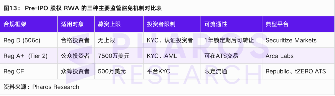 從市場背景來看,隨著 Securitize、Arca Labs、Republic 等合規代幣化平台的崛起,傳統 VC/PE 所持有的非流動性股權資産,開始具備通過區塊鏈進行份額化+證券化的技術路徑,其本質類似於將一級市場權益進行結構化拆分,並在受監管環境中引入類二級市場機制;但與 RealT 或 Ondo 等資産不同,Pre-IPO 股權的風險定價、信息披露與轉讓限制更為嚴格,因此其制度設計更加依賴美國證券法豁免體係。從具體實現路徑看,目前市場已逐步形成以 Reg D、Reg A+ 與 Reg CF 為核心的合規三角:其中 Reg D(Rule 506(c))對應高淨值合格投資者,是當前大額融資與機構參與的主通道,其特點是發行效率高但流動性受限(通常需 1 年鎖定期);Reg A+(Tier 2)則在一定程度上打開公眾投資者參與空間,兼顧融資規模與合規披露要求,使資産具備在 ATS(Alternative Trading System)上的有限流通能力;而 Reg CF 更強調分散化參與+風險控制,其制度設計並非簡單降低門檻,而是通過對投資者年度投資額度的動態約束,將其定位為用戶參與層或社區權益池,這一點與供應鏈金融 RWA 中次級資金吸收風險的邏輯存在一定相似性。從案例經驗來看,當前主流 Pre-IPO RWA 項目通常採取上層 Reg D/Reg S 募資 + 下層 Reg CF 用戶參與的雙層結構,以兼顧融資效率與社區擴展,這與前文中提到的結構分層趨勢高度一致。因此可以認為,Pre-IPO 股權 RWA 並非簡單復制房地産或債券類資産的上鏈路徑,而是在更強監管約束下,對傳統私募股權流動性問題的一種制度性修正,其核心價值在於:在不突破證券法底綫的前提下,引入鏈上技術提升資産可達性與流動效率,但其發展邊界始終由合規框架所決定。