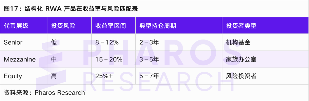 在 Pre-IPO 股權 RWA 中,投資周期通常在 3 至 7 年之間。根據 Securitize 和 Republic 平台的歷史數據[14] ,投資者的内部收益率(IRR)介於 12% 至 25% 之間,盡管存在較大的波動區間。隨著鏈上結構化産品的出現,收益分層設計開始被廣泛採用:
