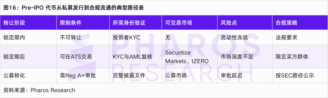 在前面的分析中,我們探討了房地産 RWA(RealT)、固定收益 RWA(Ondo Finance)以及供應鏈金融 RWA(Centrifuge)等不同資産類型的核心結構與合規路徑。相比之下,Pre-IPO 股權 RWA 的流動性機制與轉讓限制顯得更為復雜,主要受限於鎖定期、投資者適格性要求以及監管豁免條件等因素。以 Securitize 為例,其代幣發行後需要遵守至少 12 個月的鎖定期,之後才能在與之相應的受監管 ATS 上進行轉讓。這一流程體現了 Pre-IPO 股權 RWA 在流動性釋放過程中必須遵循的嚴格規定。
