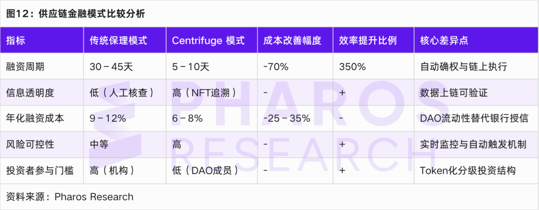 通過對比傳統保理模式與 Centrifuge 模式,RWA 在融資周期、信息透明度、資金成本及違約控制方面均表現出顯著優勢。