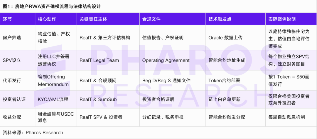在 RealT 體係中,確權環節是最關鍵的監管環節。每一處房産在上鏈前,必須完成産權審查、估值認證及 SPV 登記。該 SPV 通常在美國密歇根或特拉華州設立,以 LLC(有限責任公司)形式存在,RealT 負責物業管理與收益發放。下表展示了 RealT 標準化資産確權流程。