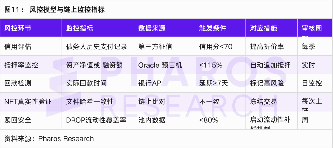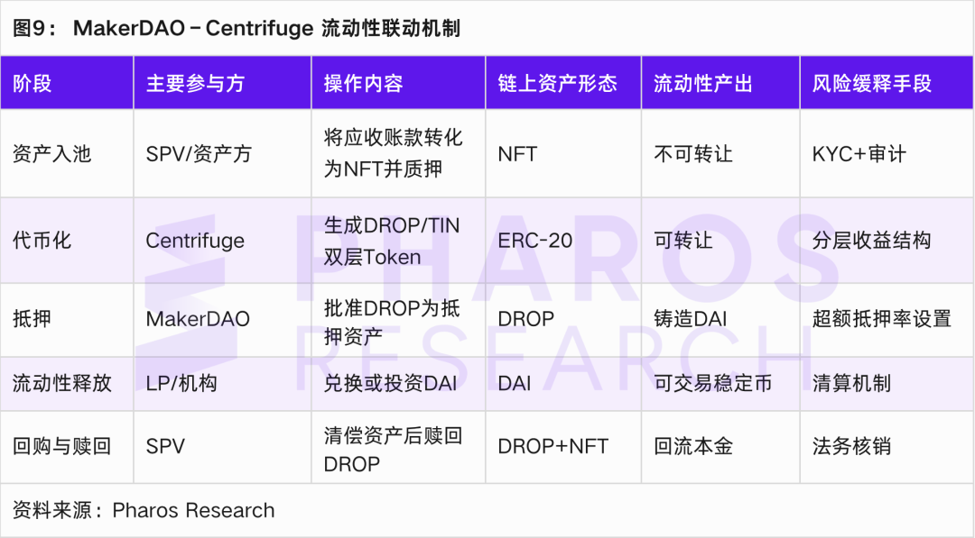 當然,這一機制能夠成立的前提,在於多重風險緩釋手段的共同作用。一方面,Centrifuge 通過分層結構將風險優先分配給 TIN 持有者,從而為 DROP 提供信用緩沖;另一方面,MakerDAO 對 DROP 設置較高的超額抵押率,並配合清算機制控制係統性風險。此外,底層資産仍然依賴 SPV 結構、審計與法律約束來確保真實回款,這意味著鏈上信用並未脫離現實法律體係,而是形成了一種鏈上+鏈下共同約束的混合模式。