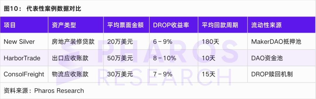 (2)HarborTrade 案例:國際貿易應收賬款 RWA 化 HarborTrade 在貿易融資環節引入 RWA 結構,核心資産為出口方應收賬款。[12]通過 Centrifuge 係統生成 NFT 憑證後,DROP 投資人資金通過 SPV 直接回流出口企業,融資到賬周期由數周級別下降到單周或更短(具體項目可降到 1-2 周,需項目方流水證明)。