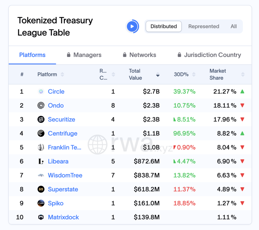 1. 資産結構層面:RealT 通過 SPV 確權與 Reg D/S 合規發行模式,突破房地産投資者門檻,實現小額分割投資;Ondo 則以美國國債為底層資産,借助 BlackRock 與 Coinbase 的託管機制,實現了鏈上類貨幣基金功能;Centrifuge 以 Tinlake 機制將供應鏈應收賬款上鏈,MakerDAO 提供抵押 DAI 流動性,形成鏈上保理的新範式。