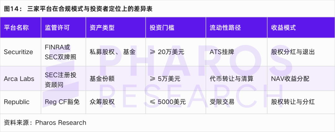 從實踐路徑來看,以 Securitize、Arca Labs 與 Republic 為代表的三類平台,分別對應了基礎設施驅動型、基金結構重構型與眾籌普惠型三種典型範式:首先,Securitize 更像是數字證券時代的底層操作係統,其通過打通發行、登記、合規與交易(ATS)的一體化體係,將原本割裂的私募股權流程模塊化與鏈上化,使 Pre-IPO 股權具備可編程流通的可能,其推出的 Pre-IPO Equity Token Program,本質上是幫助企業在 IPO 之前釋放部分流動性,同時通過 Reg D 等路徑嚴格限定投資者範圍,從而在效率與合規之間取得平衡;其次,Arca Labs 則從資産結構層面進行重構,其將 Pre-IPO 股權納入基金容器,通過 NAV(淨值)機制實現類公募化表達,這種模式的關鍵不在單一項目流動性,而在組合層面的風險分散與估值平滑,某種程度上更接近傳統資管邏輯在鏈上的映射;最後,Republic 則代表了另一種路徑——通過 Reg CF 框架降低參與門檻,將 Pre-IPO 投資從高淨值人群向大眾投資者延伸,其通過區塊鏈完成股權登記與分紅自動化,使小額、多元、分散的投資結構具備可執行性,但與此同時也天然面臨更強的流動性限制與信息披露壓力。