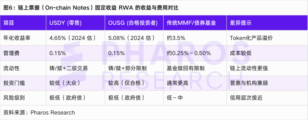 在固定收益類 RWA 體係中,收益模型的核心邏輯並未脫離傳統金融本質,而是在鏈上結構中實現了更高效率的收益再分配與流動性增強。以 Ondo Finance 為代表的國債 RWA 産品,其收益主要來源於底層美國國債利息,同時疊加資金池運營效率所帶來的結構性溢價,以及鏈上二級市場所賦予的流動性溢價。從實際數據來看,2024 年 USDY 與 OUSG 産品的年化收益率約在 4.6%–5.4% 區間[3],這一水平在當前利率環境下不僅顯著高於多數傳統貨幣基金,同時也體現出鏈上資産在費用壓縮與分銷效率上的優勢。更關鍵的是,這類産品通過 Token 化形式,將原本封閉在機構體係内的收益資産進行再包裝,使其能夠同時面向零售與合格投資者兩類群體,從而在收益結構之外,進一步創造出市場擴張價值。