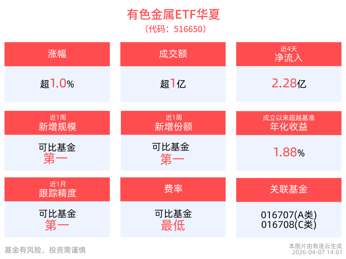 截至2026年4月7日 ,稀土、鋁概念午後異動,截至14:01,有色金屬ETF華夏(516650)上漲1.04%,其持倉股中稀有色漲停,盛和資源上漲5.82%,天山鋁業上漲5.55%,中孚實業,北方稀土等個股跟漲。統計顯示,有色金屬ETF華夏(516650)近4個交易日内有3日資金淨流入,合計「吸金」2.28億元。