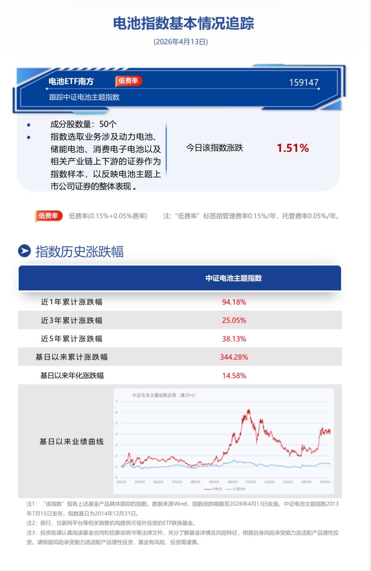 截至2026年4月13日收盤,電池ETF南方(159147)換手3.92%,成交0.65億元,跟蹤標的指數中證電池主題指數(931719.CSI) 漲1.51%。