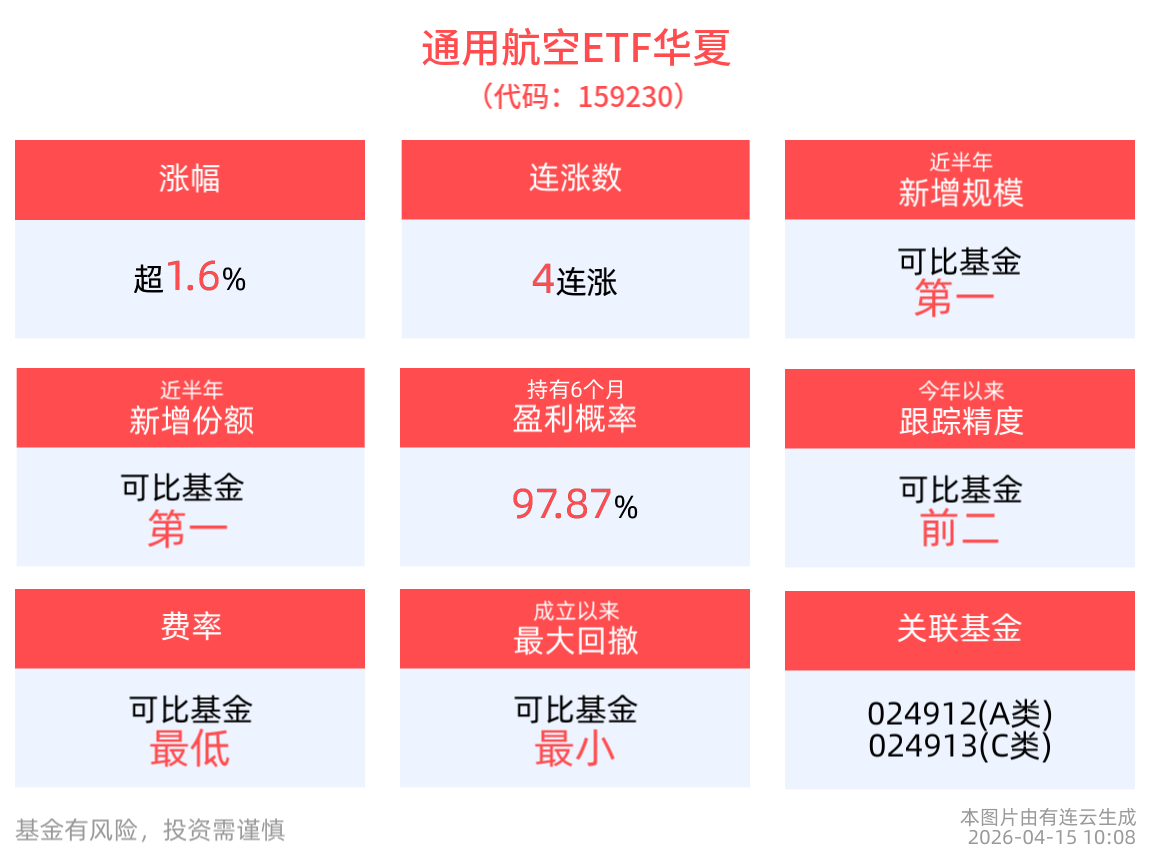 4月15日,受中東局勢降溫利好催化,A股三大指數集體走強, 通用航空板塊大幅走強,截至10:08,通用航空ETF華夏(159230)上漲1.62%, 沖擊4連漲,其持倉股廣聯航空上漲7.49%,英搏爾上漲6.84%,航天環宇、航天宏圖、航天電子等個股跟漲。