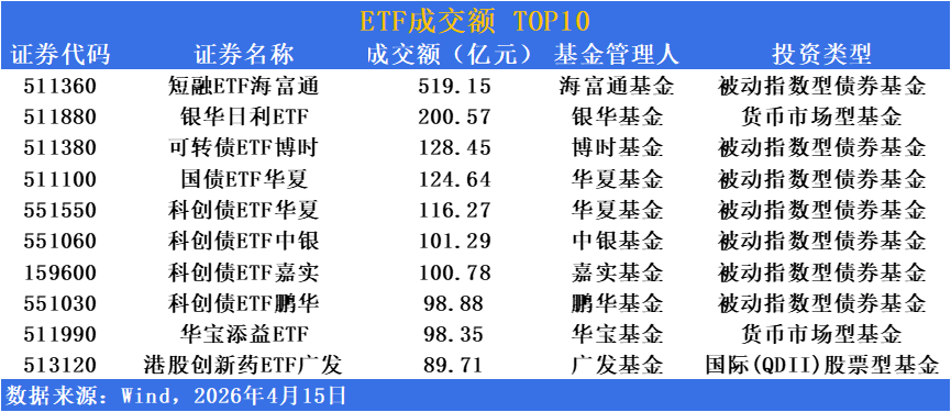 短融ETF單日成交超519億元位居成交榜榜首,作為短久期信用債工具持續擔當資金管理利器,受益於市場資金面寬松背景下的現金管理需求升溫。
