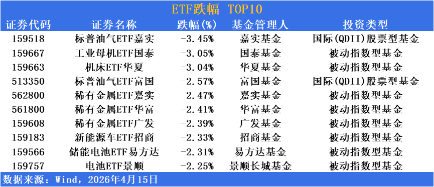 此外,受制造業景氣度波動及設備更新政策預期邊際減弱影響,工業母機與機床板塊同步調整,相關ETF跌幅均超3%;稀有金屬板塊跟隨大宗商品價格回落,多只産品跌幅超2%;新能源産業鏈上遊材料需求預期修正,電池及新能源車相關ETF亦集體下挫,跌幅均超2%,顯示資金正從高估值成長板塊及周期性資源品方向加速切換。